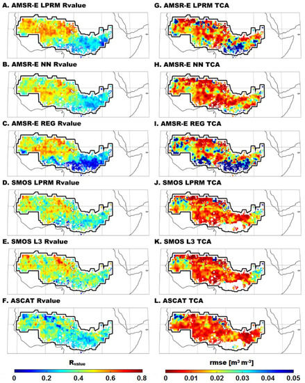In order to overcome these problems, several methods have been developed that are better able to quantify the skill of soil moisture datasets. One of these is a large-scale precipitation-based validation technique that provides a robust representation of (anomaly) correlation-based skills in satellite soil moisture retrieval through data assimilation (expressed as the Rvalue) [35,36]. Another method is the Triple Collocation Analysis (TCA) [24,37,38,39], which uses three collocated soil moisture datasets in order to estimate the root mean square error (rmse) of the random error component of the actual estimate, in the absence of a dataset that can be used as the absolute truth at the global scale and provided some conditions are satisfied. As these statistical methods also have their limitations (for example, correlated errors in soil moisture datasets could lead to uncertainties in TCA results), it is important to interpret them together instead of using a single metric.