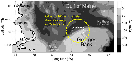 Location of the Ocean Acoustic Waveguide Remote Sensing (OAWRS) Gulf of Maine 2006 experiment. The yellow dashed circle shows 100-km diameter OAWRS areal coverage in 75 s. The white rectangular box represents the area investigated here. The gray scale shows the variation in the bathymetry in the region.