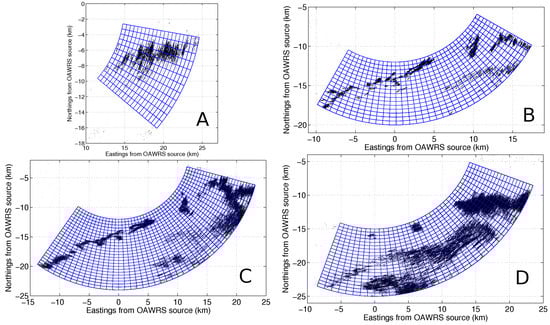 Here, herring groups’ depth information is inferred from the instantaneous OAWRS horizontal 2D images taken at multiple frequencies, yielding instantaneous 3D spatial distributions of large herring groups. This is done by determining the herring group vertical distribution parameters via an exhaustive search for an empirical best-fit between the measured and modeled frequency responses of resonant scattering from herring swimbladders (Equations (10) and (11)). The herring group parameters include mean shoal depth, shoal thickness, neutral buoyancy depth, and areal population density, assuming that herring are in an approximately uniform vertical layer [1,4,5]. The analysis is done for shoal segments that sub-divide the herring high-density area into a number of annular sectors (Figure 2) such that the spatial variation in the herring groups’ spatial structure is investigated in an efficient manner (Section 2.4). The measured frequency response of herring scattering at each horizontal position is obtained from the instantaneous multi-spectral OAWRS scattering strength images (Section 2.2), whereas the modeled frequency response is obtained from a swimbladder resonance model [17,18] as described in Section 2.5.