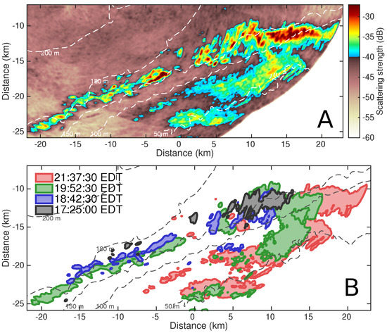 (A) highest measured scattering strength for each spatial position on the northern flank of Georges Bank during shoal formation and subsequent migration towards spawning grounds monitored from 17:25:00 to 21:37:30 EDT on 29 September 2006. Herring begin the shoal formation process at locations with seafloor depth of roughly 140 m to 180 m at 17:25:00 EDT, further develop along the bathymetric contour and into the shallower waters, and then stay mostly at locations shallower than 140 m at 21:37:30 EDT; (B) time evolution of high herring scattering area from 17:25:00 to 21:37:30 EDT on 29 September 2006. The OAWRS sensor location at 21:37:30 EDT on 29 September 2006 is the coordinate origin.