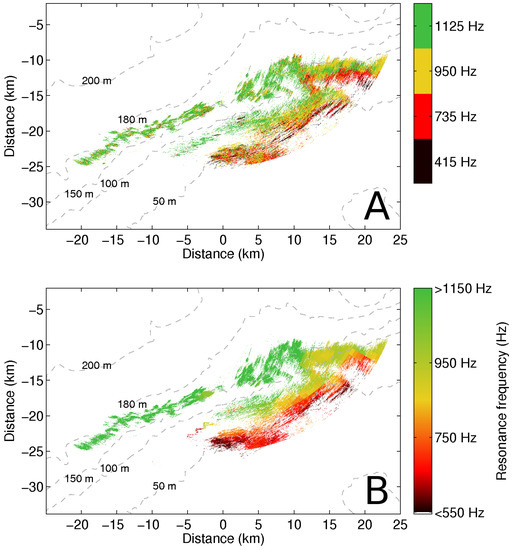 (A) spatial distribution of frequency at which the strongest acoustic scattering occurred within vast herring groups imaged from 17:25:00 to 21:37:30 EDT on 29 September 2006. Gradual decrease in the strongest scattering frequency with decreasing seafloor depths indicates a consistent shift in the resonance frequency of herring scattering during the spawning migration towards the spawning grounds on Georges Bank; (B) the spatial distribution of the resonance peak frequency within vast herring groups imaged from 17:25:00 to 21:37:30 EDT on 29 September 2006.