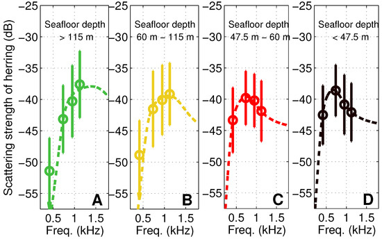 where is the hydrostatic pressure at neutral buoyancy depth, is the atmospheric pressure, is the hydrostatic pressure at herring occupancy depth, is the upper bound for percentage difference between and for positive buoyancy, and is the upper bound for percentage difference between and for negative buoyancy [25,26]. The least-squares estimation in log-transformed scattering strength domain in decibels (Equations (10) and (11)) leads to a negligible bias in the mean scattering strength estimates with a large sample size [15], which is the case for this analysis. We restrict our analysis to the acoustic measurements with no data contamination from other ocean acoustic sources including ambient noise, shipping, marine animal vocalizations, and seafloor scattering. To address this issue, only frequency responses exceeding the mean background level by at least 10 dB were included in the analysis.