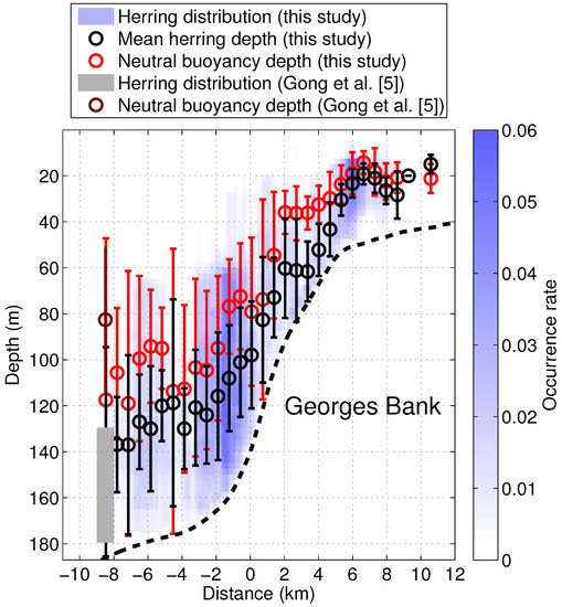We find herring groups maintain near-bottom vertical distributions with negative buoyancy throughout the migration (Figure 6). The mean herring group depths are found to follow the seafloor depths during the migration as shown in Figure 6 and Figure 7. For the entire migration path, herring are found to stay close to the seafloor and follow the sloping bottom towards Georges Bank, which is characterized by a high normalized correlation coefficient of greater than 0.9 between the average herring group depth and the corresponding seafloor depth for migration paths along the bathymetric gradient. This is reasonable given that herring would not have a priori knowledge of their exact final spawning positions and the detailed bathymetry along the entire migration path. The vertical distribution of herring obtained here for the deeper water region is consistent with that measured by downward-directed echosounders in the initial stage of the spawning process in the deeper basin area during the same OAWRS experiment [1], where dense herring groups were found to occupy below the water depths of roughly 100 m at roughly 180–200 m seafloor depth [1,5].