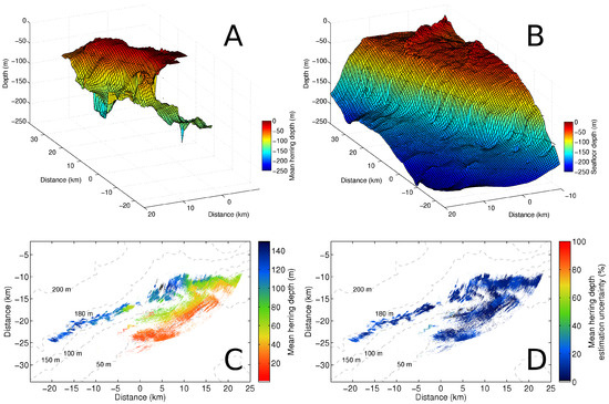 (A) 3D surface of mean herring group depth determined from multi-frequency measurements taken from 17:25:00 to 21:37:30 EDT on 29 September 2006; (B) seafloor depth of the sloping bottom on the northern flank of Georges Bank. The mean herring group depth and the seafloor depth are found to be highly correlated (0.9 correlation coefficient) for migratory paths along the bathymetric gradient; (C) the horizontal distribution of mean herring group depth; (D) estimation uncertainty for mean herring group depth in percentage determined by Equation (13). The rest of the estimated herring group parameters and corresponding estimation uncertainties are shown in Figure A2.