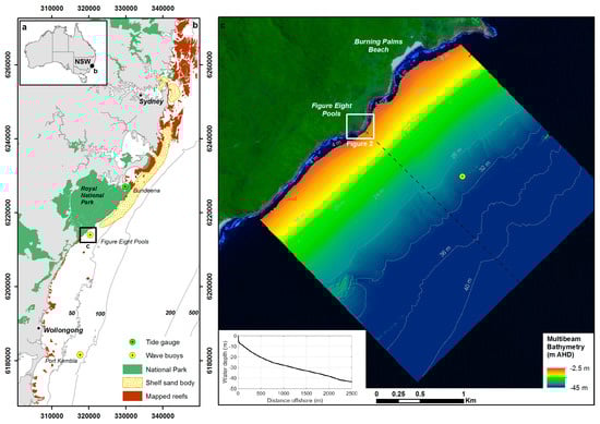 (a,b) The Figure Eight Pools Rock Platform is located in the Royal National Park, approximately 50 km south of Sydney, NSW, Australia. (b) The coastline trends northeast-southwest and is fully exposed to waves arriving from the northeast to south directions, as measured by the Port Kembla permanent wave buoy. (c) A directional wave buoy was deployed temporarily in 30 m water depth adjacent to the Figure Eight Pools Rock Platform to measure local wave conditions, and the inner-shelf seabed was surveyed using a multibeam echosounder. Inset shows a shore-normal bathymetric profile along the dashed line. Adapted from [].