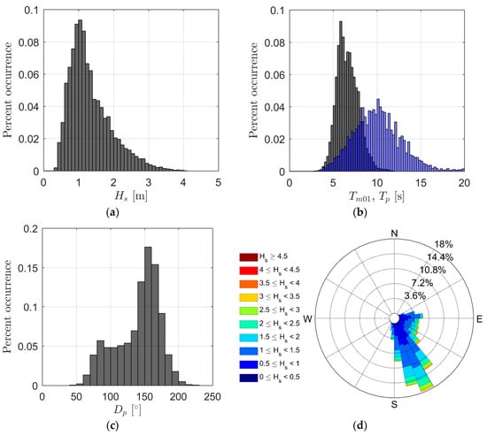 Local wave conditions at the site: histograms of percent occurrence for (a) significant wave height (Hs), (b) spectral mean wave period based on the first positive moment of the energy spectrum (Tm01; grey bars) and spectral peak wave period (Tp; blue bars), and (c) peak wave direction (Dp); and (d) a wave rose of Hs. See Figure 1c for wave buoy location relative to the rock platform. Data are for the period 6 December 2016 to 30 October 2017.