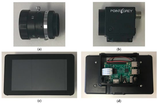 Components of the camera system: (a) camera lens, (b) camera, (c) Raspberry Pi computer touch screen, and (d) Raspberry Pi computer and case.