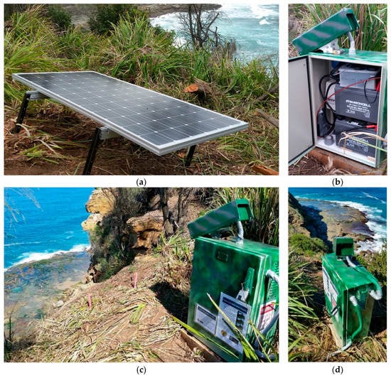 Another challenge was the lack of mains power at the camera sites. As such, each camera system is powered by a 200 W 24 V solar panel (Figure 5a) connected to a 15 A solar regulator and two 12 V 138 Ah gel batteries (Figure 5b), with 12 V to 5 V converters to supply power to the camera and computer at the required voltages. The system was designed to contain sufficient backup power to cover periods of poor weather and low incident sunlight even during the winter months, with sufficient power from fully charged batteries to cover eight days with no battery recharge from the solar panels. The camera sites are situated near the edge of the coastal cliff and are exposed to high winds and salt spray. To protect the camera and power system components, all electronics are stored in a standard, ventilated steel locker, with the cameras mounted in standard security camera housings (see Figure 5c,d). The computer components were further sheltered from moisture and salt spray by a plastic box inside the steel locker (Figure 5b). The electronics lockers and camera housings were painted to further minimize the low visual impact of the camera systems on the natural aesthetics of the site.