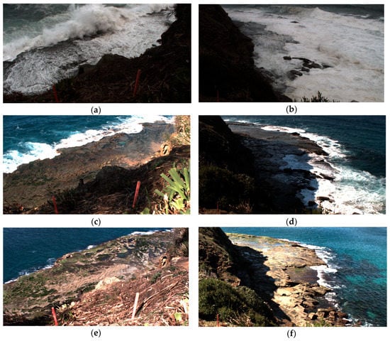 An alternative approach to managing visitor safety is to develop tools that predict and communicate the hazard level on individual platforms based on the relationship between platform morphology and forecast wave and tide conditions. This is analogous to managing forest fire hazard with the Forest Fire Danger Index (FFDI), which uses forecast fire weather parameters and the vegetation fuel state to determine and communicate the forest fire risk level []. Similarly, developing a wave hazard risk rating for rock platforms requires sufficient data and understanding of the influence of the local wave and tide conditions on wave overtopping at the platform of interest. Obtaining data on the time varying wave hazards on a rock platform may be challenging due to the exposed setting and potential difficulty in deploying instruments that record data in situ. For example, wave sensors may be temporarily deployed with relative ease in beach settings using movable frames or metal stakes inserted into the sandy substrate; however, deploying such instruments on a rock platform may require a more permanent and invasive approach, such drilling into the platform to create secure fixtures, and the instruments may be vulnerable to human disturbance during low tides or calm conditions. Remote sensing provides an attractive alternate means of measuring wave processes and hazards on rock platforms.