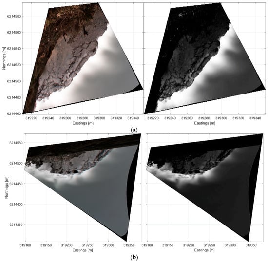 Example timex (left panels) and variance (right panels) images created from the camera data for (a) the north camera and (b) the south camera 12:00 on 23/03/2017. Eastings and northings correspond to the coordinate system GDA94 MGA Zone 56.