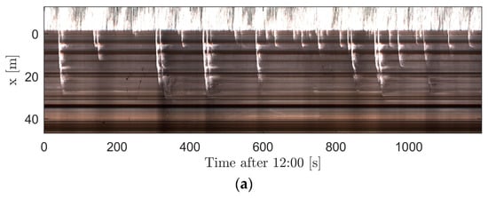 An example 20-min timestack, obtained from transect N2 during a period of intermittent overwashing, is shown in Figure 8a. Near continuous wave breaking seaward of the platform edge can be seen by the white pixels at x < 0 m for the full duration of the timestack. Intermittent wave overwashing can be seen throughout the length of the timestack (white wave paths running in near vertical lines down the timestack from the platform edge at x = 0 m). The majority of overwash events are relatively small, only inundating the seaward edge of the platform to x~7 m; however, nine events extend significantly further on to the platform, to x~24 m. This timestack describes intermittent overwash conditions of variable magnitude.