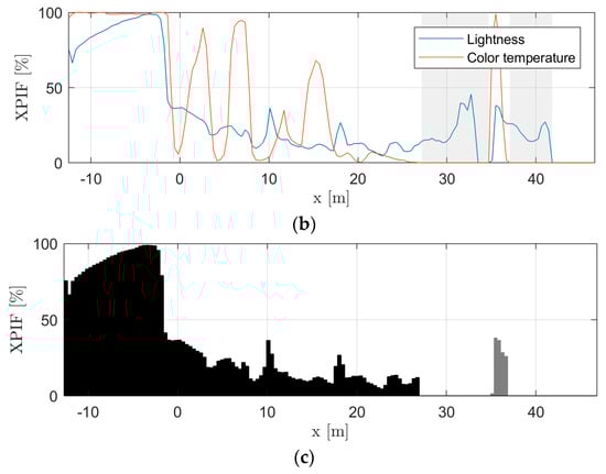 Using the method described in Section 3.2, pixel values in the timestack were converted to lightness values and color temperature values, which were used to calculate the frequency of inundation. The cross-platform values of these two metrics for the example timestack are shown in Figure 8b with the final combined metric shown in Figure 8c. The pixel analysis metrics yield high frequencies of inundation (close to 100%) seaward of the platform edge which corresponds well to the observations of the timestack that suggest near continuous wave breaking seaward of the platform edge (Figure 8a,b). Landward of the platform edge, the frequency of inundation drops to below 40% and continues to decrease as distance onto the platform increases, as per the observations of the timestack, indicating decreasing frequency of intermittent overwashing. The use of color temperature to disregard erroneous overwash is demonstrated at 27 < x < 34 m and 37 < x < 47 m (shown by the grey shaded areas in Figure 8b and the final inundation frequencies in Figure 8c). Small peaks in XPIF between the edge of the platform and the landward limit of inundation correlate with pools and slight changes in elevation across the platform (Figure 8c). The erroneous spike at x~35 m, which is due to high pixel lightness and color temperature potentially caused by standing water on the platform (grey bars in Figure 8c), was removed by automated quality control methods to obtain the final cross-platform inundation frequency profile (black bars in Figure 8c).