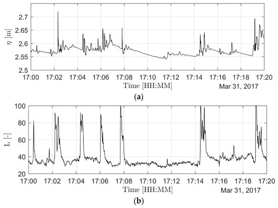 Comparison of (a) water surface elevation time series derived from the pressure transducer data (η), and (b) the pixel lightness metric (L) from the pixel at the transducer deployment location obtained from the rectified camera imagery from 31 March 2017. Water surface elevations are shown relative to the PT location at the bottom of the pool on the rock platform that had a depth of ~2.5 m. The PT location shown here was the northeast PT of the two deployed on 29 March 2017 (319,261 m E, 6,214,520 m N). See Figure 2 for location.