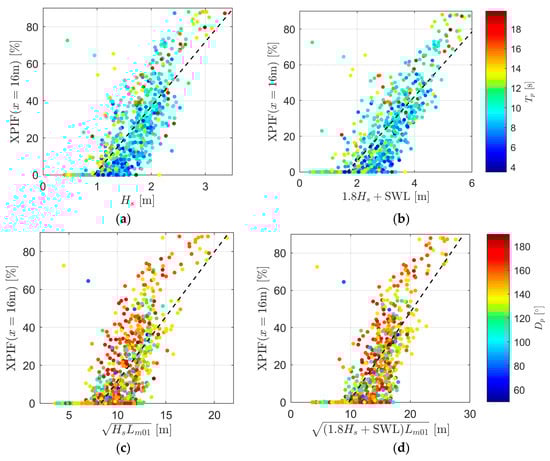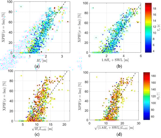 As with the comparisons of XPIF(x = 16 m) with and , XPIF(x = 5 m) remained close to XPIF = 0% for low values of and then increased rapidly with increasing and (Figure 11c,d). The coefficients of determination for the comparison of XPIF(x = 5 m) with and were 0.46 and 0.48 respectively, lower than those of Hs and 1.8 Hs + SWL but still statistically significant. No clear trends were observed with respect to the influence of peak wave direction on inundation frequency (see point colors in Figure 11c,d).