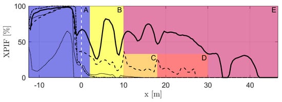 Five examples of XPIFs recorded at transect N2 under different conditions that meet the criteria for the five hazard categories (Table 2): Category A recorded on 22/03/2017 at 12:00 (dotted line), Category B recorded on 26/03/2017 at 16:00 (dash-dot line), Category C recorded on 26/03/2017 at 11:00 (thin solid line), Category D recorded on 23/03/2017 at 12:00 (dashed line), and Category E recorded on 04/04/2017 at 17:00 (thick solid line). The shaded areas represent the five hazard categories defined for transect N2: Category A (blue), Category B (yellow), Category C (orange), Category D (red), and Category E (purple). A profile line terminates (i.e., XPIF goes to 0) in the shaded area of the hazard category to which it belongs, e.g., the dashed line (representing an example XPIF profile for Category D) terminates in the red shaded area at x~27 m. The white dashed line represents the edge of the platform at x = 0 m. See Section 5.3 and Table 2 for additional detail on the hazard categories.