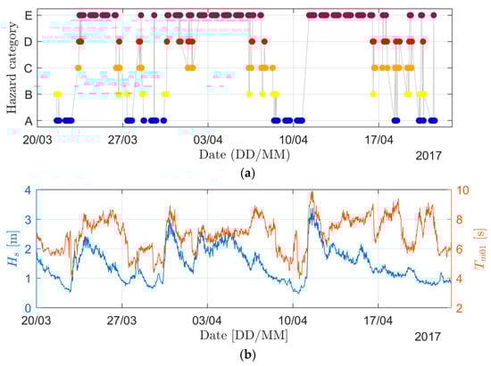 (a) Time series of the hazard category at transect N2 for the first month of camera deployments (21/03/2017 to 21/04/0217). See text in Section 5.3, Figure 13, and Table 2 for further explanation. (b) Time series of significant wave height (Hs; blue line and left y-axis) and spectral mean wave period based on the first positive moment of the energy spectrum (Tm01; red-orange line and right y-axis) from the wave buoy deployed in 30 m of water offshore of the platform (see Figure 1c for location) for the first month of the camera deployments.
