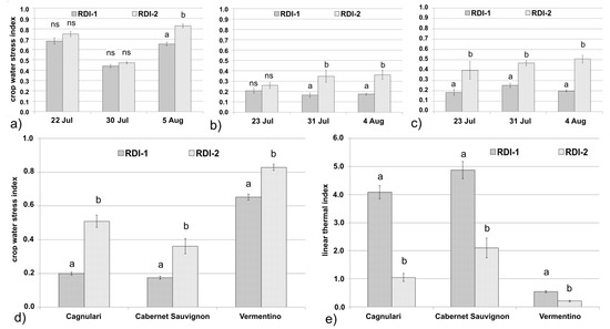 Crop water stress index (CWSI) for (a) ‘Vermentino’ at Arzachena, (b) ‘Cabernet Sauvignon’ at Usini, and (c) ‘Cagnulari’ at Usini, under moderate (RDI-1) and severe (RDI-2) water deficit regimes during three sampling days from berries at pea-size stage until maturation. (d) CWSI for all cultivars under moderate and severe water deficit regimes measured on the UAV flight days. (e) Linear thermal index (lg) for all cultivars and both sites under moderate and severe water deficit regimes measured on the UAV flight days. Values are means ± SE (n = 9). Different letters indicate significant differences between treatments (p ≤ 0.05) based on one-way ANOVA (Tukey test).
