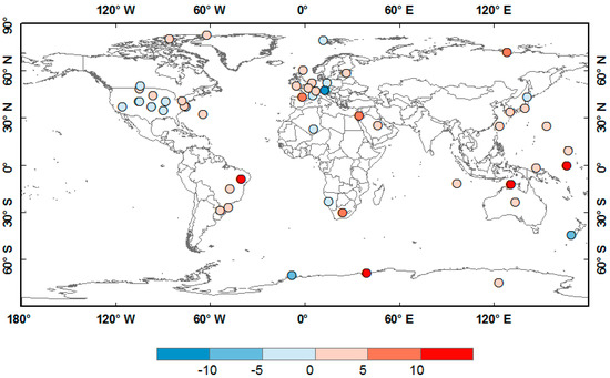 Mean surface incident solar radiation (Rs) bias value among data for 54 Baseline Surface Radiation Network (BSRN) and Clouds and Earth’s Radiant Energy System Energy Balanced and Filled (CERES EBAF) surface sites. Unit: W·m−2. The biases exhibit a nearly homogeneous spatial distribution ranging from −10 to 10 W·m−2.
