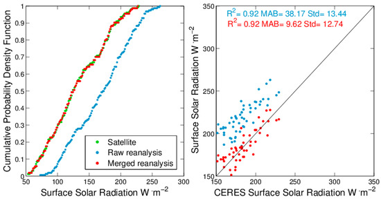 European Reanalysis Interim (ERAI) data for one grid box, merged by the cumulative probability density function-based (CPDF) method. The grid box was randomly selected. The probability density function curves of original ERAI reanalysis, merged ERAI reanalysis, and CERES EBAF surface (CERES) are in blue, red, and green, respectively. A comparison of raw ERAI (blue), merged ERAI (red) and CERES EBAF surface data is on the right. MAB values were calculated using the mean of the absolute value of difference between the reference and observed data. The Std represents the standard deviation of the difference between the reference and data. The reference data is CERES EBAF surface data. Each point in the right subplot is monthly surface solar radiation values.