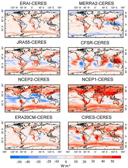 The globally-averaged MAB values, which were calculated by averaging the absolute values of the differences between the reanalyses and the CERES EBAF surface product, were 12.62 W·m−2 (7.70% in relative value) for ERAI, 16.15 W·m−2 (10.09%) for MERRA2, 15.27 W·m−2 (9.15%) for JRA55, 17.80 W·m−2 (10.69%) for CFSR, 23.13 W·m−2 (13.63%) for NCEP2, 27.15 W·m−2 (14.61%) for NCEP1, 15.04 W·m−2 (9.03%) for ERA20CM, and 19.39 W·m−2 (11.05%) for CIRES (Table 1).