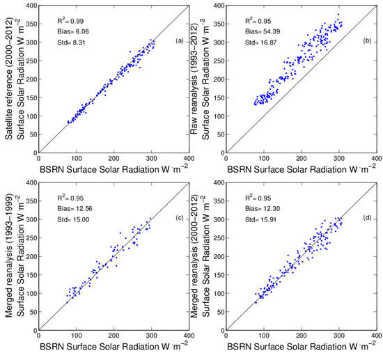 Figure 4 shows a single site example of the comparison of the merged and raw NCEP1 data. This BSRN Billings site (latitude: 36.6N, longitude: 97.51W) is located in the Southern Great Plains of the United States, and the observation period was from 1993 to 2012. CERES EBAF surface data, raw NCEP1, and merged NCEP1 data are all highly correlated with the BSRN field observations, with an R2 value of 0.95, due to the monthly records including seasonality well-simulated in the data. Compared with the CERES EBAF surface data, the raw NCEP1 data showed poor performance, with an MAB of 54.39 W·m−2 and a Std of 16.87 W·m−2. However, the merged NCEP1 data performed better, with a lower MAB (12.30–12.56 W·m−2) and Std (15.00–15.91 W·m−2), for both the period after the year 2000 with the reference data and the period before 2000 without the reference data.