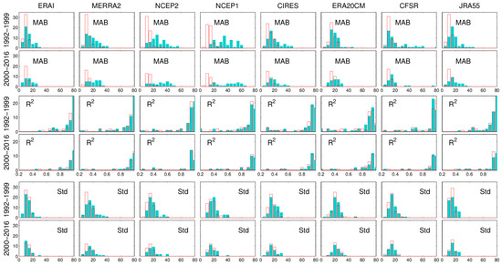 Histograms of the statistical parameters of the comparisons between merged and original reanalyses. In each sub-histogram, the horizontal axis represents statistical values, and the number of station is recorded on the vertical scale. The hollow red column represents the results merged using CPDF, and the light blue column is original results for each reanalyses. The MAB, R2 (determination coefficient), and Std (stand deviation) at each station are calculated from monthly Rs data. Each column represents different reanalyses. The first and second row represent histograms of MAB with the reference (after 2000) and without the reference (before 2000) data. The third and fourth rows are the same, but for the histograms of R2 at each site. The fifth and sixth rows are the histograms of Std at each site.