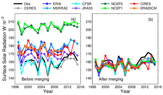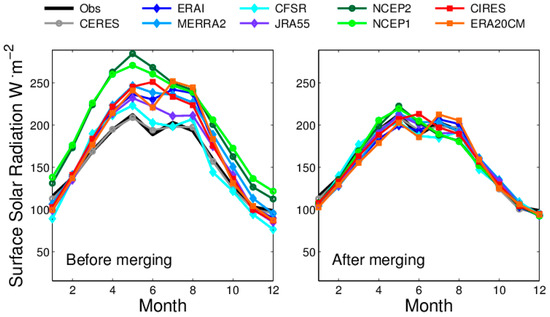 The differences of post-merging MAB values are mainly attributed to the ability of each reanalysis to simulate the spatial-temporal distribution of clouds, and the impact of the variation of aerosols [58] on Rs. For instance, the ERA20CM data assimilated fewer observations and produced a high Std, which indicates a limited ability to simulate the spatial–temporal patterns of clouds. Therefore, the post-merging MAB values are large for ERA20CM. NCEP2, which refines the cloud algorithms that are produced, has a lower post-merging MAB than NCEP1 [47]. The current reanalyses, except for MERRA2, primarily used climatology aerosols. Thus, another reason for the post-merging MAB results might be the impact of aerosols on long-term trends in Rs values [59]. Focusing on the impact of aerosols in this issue will be our subject of future work.