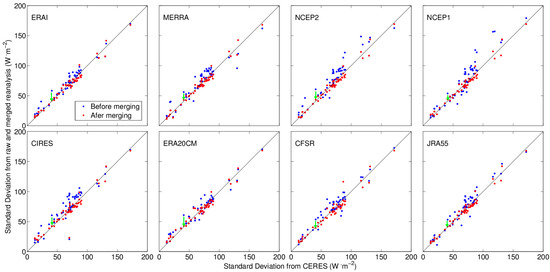Comparison of the seasonal variability in the merged and raw reanalyses. Seasonal variability is described in using standard deviation (Std) of the multiyear mean monthly Rs from merged and raw reanalyses. In each scatterplot, the horizontal axis represents the Std from the CERES EBAF surface product, and the vertical axis represents the Std from the merged and original reanalyses. The red dots denote merged results using CPDF, and the blue dots denote original reanalyses. Each point in the figures corresponds to each BSRN site.