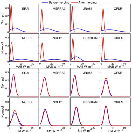Mean absolute bias (MAB) and standard deviation (Std) between each reanalysis and the CERES EBAF surface product for annual mean Rs. In each subplot, the horizontal axis represents statistical values, and the vertical axis represents the normal probability density distribution function (Normpdf). The red line denotes the merged results using CPDF, and the blue line denotes the raw reanalysis.