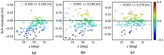 One-way satellite laser ranging (SLR) residuals of (a) Extended CODE Orbit Model (ECOM1), (b) extended ECOM model (ECOM2), and (c) adjustable box-wing model (ABW) orbit solutions of BeiDou-3 I2-S satellite with respect to the ε angle.