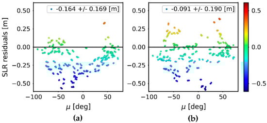 One-way SLR residuals of (a) ECOM1 and (b) ECOM2 orbit solutions of BeiDou-3 I2-S satellite with respect to the μ angle.