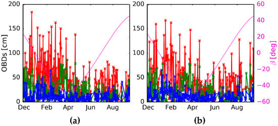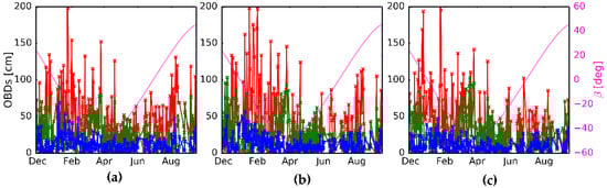 Time series of daily OBDs for the two solutions are illustrated in Figure 7, and Table 5 lists the mean values in Along-track, Cross-track, and radial directions. For both solutions, almost identical OBDs are achieved, and show similar performance as that of ECOM1 solution. The radial OBDs show β angle dependent variations, and the worse OBDs have been identified in eclipse periods. For Galileo satellites with a priori model for ECOM1 [], the OBDs also have similar performance as that of solution determined with ECOM1 only.