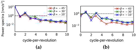 The SRP accelerations for BeiDou-3 I2-S satellite were reconstructed by orbit integration with the determined orbital elements and SRP parameters from the ABW solution, and were decomposed in DYB frame. Figure 4 illustrates the amplitude spectra of the reconstructed SRP acceleration for β angle about 10°, 30°, and 45° in DYB frame. The strength of spectra line for 0-cpr signal in D reaches to about −100 nm/s2, where it is about 1 nm/s2 in B direction. For other periodic signals, the sizeable spectral lines exist for even orders in D. However, for B axis the sizeable spectral lines exist for odd orders in B. Similar results were obtained for GPS and GLONASS []. A significant 1-cpr signal in B with amplitudes of about 2 nm/s2 can be identified. The accelerations along Y are not presented here as the order of that is as small as 0.1 nm/s2.