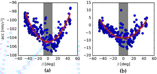 Afterwards, the coefficients in Equation (14) were estimated by fitting with the daily reconstructed accelerations in each axes. Clear β-angle-dependent variation for D0,ap and D2c could be observed, as shown in Figure 5. The estimations of D0,ap and D2c show parabola variations against β angle with 0° vertices. These indicate that the model needs to be improved further with accounting for such variations. To model them, we fitted these parameters with the 2-order polynomial against the β angle for D0,ap and D2c. The derived coefficients for the model are listed in Table 4.