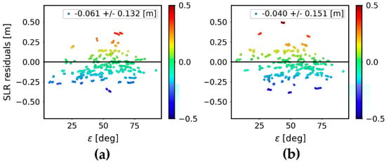 One-way SLR residuals of solutions using the a priori (a) cuboid model and (b) fast Fourier transformation (FFT) model for BeiDou-3 I2-S with respect to ε angle.