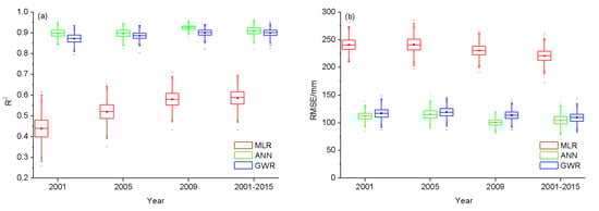 Obtaining the regression relationship between the TRMM precipitation and environmental variables, is a vital premise of the downscaling procedure, which directly affects the final result. Therefore, the predictive performances of three regression models (MLR, ANN, and GWR) were evaluated by comparing the predicted annual precipitation by each model with the original TRMM annual precipitation at 0.25° resolution. To better compare the performance of the three models, a bootstrapping procedure was employed to create a sample of the same size as the original data, a total of 1000 tests were conducted, and performance metrics (i.e., R2, RMSE, MAE, and Bias) were calculated accordingly. Table 1 shows the mean values and 95% confidence interval of R2, RMSE, MAE, and Bias, estimated by the three models for the three reference years and entire time period. The box plots of R2, RMSE, MAE, and Bias are shown in Figure 6. From Table 1 and Figure 6, it can be seen that both ANN and GWR produced a higher R2 and lower RMSE and MAE than that of MLR under different climatic conditions. In terms of Bias, the Bias of GWR was lower than that of ANN in three reference years and the entire time period. GWR is a regression algorithm, which adds the geographical information for each location into the regression process, potentially addressing the spatially heterogeneous relationships between various environmental factors. Compared with ANN, GWR can capture more specific, local details. Thus, GWR was chosen as the downscaling model to generate HSPD in subsequent analyses.