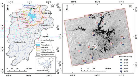 As an “Essential Climate Variable”, as identified by the Global Climate Observing System, soil moisture plays a critical role in the water and energy balance at the soil-atmosphere boundary, which has a large effect on climate [,]. At a watershed scale, soil moisture also controls the partitioning of rainfall into runoff and infiltration, and therefore has an important effect on the runoff response of catchments []. Hence, soil moisture has been widely used in various applications, such as numerical weather forecasting [], water and energy budgets simulation [], soil evaporation evaluation [], stream flow prediction [], and water resource management []. Located in the south bank of the middle reaches of the Yangtze River, Poyang Lake is the largest freshwater lake of china. The ungauged zone of Poyang Lake, which lacks hydrological observations, generally refers to the large alluvial plain stretching from seven stream flow gauging stations to the lake boundary. This region covers a majority of the Poyang Lake eco-economic zone, which is occupied by intensive rice agriculture, supporting the high-density local population. Moreover, the significant seasonal fluctuations of Poyang Lake water levels and the associated inundation areas create extensive wetland ecosystems in this region []. However, both droughts and floods have occurred frequently around the lake in recent decades, which are primarily caused by climate change and human activities []. For example, the severe continuous drought during 2006–2007 brought the lake water storage down to less than 1% of the lake capacity [], and the extrema flood event in 1998 resulted in direct economic losses of about ¥38 billion over the Poyang Lake watershed [], with most of the losses occurring within the ungauged zone. Accordingly, soil moisture estimation over Poyang Lake ungauged zone is of vital importance for flood forecasting and drought monitoring, irrigation scheduling, agriculture management, and wetland protection. Besides, knowledge of soil moisture is beneficial to the Predictions in Ungauged Basins (PUB) researches [].