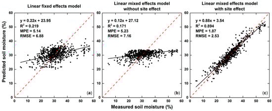Scatter plots of measured versus predicted soil moisture from (a) the linear fixed effects model; (b) the mixed effects model without site effect; and (c) the mixed effects model with site effect. The solid black line and dashed red line represent the regression line and 1:1 line, respectively.
