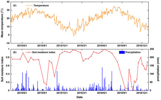 Time series of (a) daily mean temperature and (b) daily accumulated precipitation and measured soil moisture index over Nanchang site (115.9°E, 28.6°N) for the period from April 2015 to December 2016.