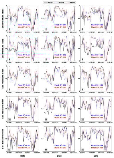 Soil moisture indices were calculated for each of the 15 observation sites, based on the Equation (4), using soil moisture time series measured and predicted from the linear mixed and fixed effects models, respectively. As an example, the temporal variation of soil moisture index derived from ground measurements, along with the daily accumulated precipitation and mean temperature over site 9 (Nanchang) are plotted in Figure 3. The daily mean temperature shows a similar pattern for the year 2015 and 2016, with the highest temperature observed between July and August and the lowest temperature between January and February. The precipitation increased significantly between April and June in both years. Moreover, due to the El Niño event, precipitation occurred frequently from the winter of 2015 to the spring of 2016. Calculated with soil moisture measurements at the depth of 0–10 cm, which represents the uppermost soil layer, the measured soil moisture indices are rather sensitive to precipitation and temperature. In response to the El Niño event and the lower evaporation rate during the non-growing season, the measured soil moisture indices over site 9 remained high from December 2015 to June 2016. In contrast, with the higher evaporation rate during the growing season and little precipitation, the measured soil moisture indices decreased dramatically from July to August in both years.