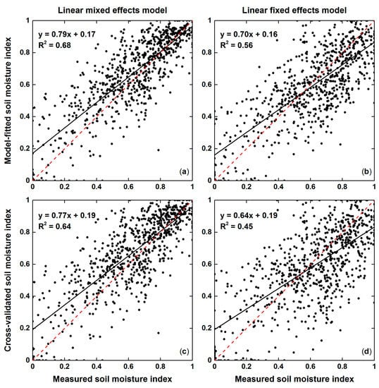 Scatter plots of measured versus predicted soil moisture indices. (a,c) are model-fitting and cross-validation results for the LME model, respectively; (b,d) are model-fitting and cross-validation results for the linear fixed effects model, respectively. The solid black line and dashed red line represent the regression line and 1:1 line, respectively.