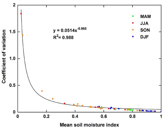 Relationship between mean soil moisture index and the coefficient of variation (CV). Each point denotes an acquisition and the colors represent different seasons (Spring: MAM; Summer: JJA; Autumn: SON; Winter: DJF).