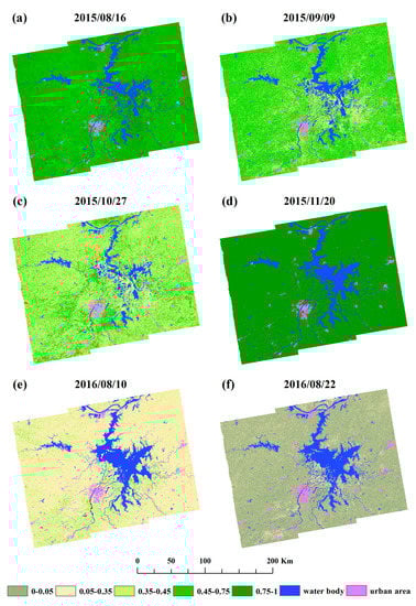 Among the 49 soil moisture index maps, six were selected to show the spatial distribution of soil moisture index under different soil moisture conditions (Figure 7). Since very few rain events occurred during late August to early September in 2015, the mean soil moisture index decreased from 0.75 on August 16 (Figure 7a) to 0.45 on September 9 (Figure 7b). More significant spatial variability can be observed from the soil moisture index map on September 9 (Figure 7b), where the soil moisture indices of the alluvial plains surrounding the Poyang Lake, which are mainly used as cultivated cropland, are much lower than those of the peripheral areas that covered largely by forests. It might be attributed to the different water-holding capacities of cropland and forest. Due to the frequent rainfall during November 2015, both the inundation area and the soil moisture index increased significantly on November 20 (Figure 7d), compared with those on October 27 (Figure 7c). Almost no spatial difference can be found in the soil moisture index map on November 20 (Figure 7d), when the moisture content over the whole region was nearly saturated. The mean soil moisture index decreased sharply from 0.33 on August 10 (Figure 7e), to almost zero on August 22 (Figure 7f), which is supposed to be related to the constantly high temperature and low precipitation during August 2016. Most of the areas suffered from drought during this period of time, while the croplands around the water bodies achieve slightly higher values on both soil moisture index maps, probably because of irrigation.