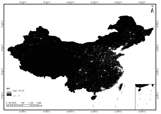 The version 1 series of the NPP-VIIRS NTL data in 2013 are acquired from the NOAA-NCEI [48]. These NPP-VIIRS NTL data are monthly and cloud-free average radiance composite images for 2013. These products are produced in 15 arc-second grids that span from 180°E longitude to 180°N and from 75°N latitude to 65°S [48] under the WGS84 geographical coordinate system. In this study, we set out to obtain the monthly average data throughout the year, but data from May to August are removed due to the lack of good quality data in the high latitudes of China. After obtaining the NPP-VIIRS NTL data spanning months 1–4 and 8–12, the monthly NPP-VIIRS NTL data are first extracted by the administrative boundary of China and projected utilizing an Albers equal-area conic projection. Next, the extracted NPP-VIIRS NTL data for each month in China are corrected with data preprocessing, which is explained in detail in Section 3.1. Finally, the average pixel brightness values from the eight corrected images are calculated and we obtain the NPP-VIIRS NTL image for 2013 in China, as shown in Figure 1.