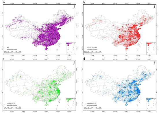 POIs of China. (a) Total POIs in China in 2014; (b) Shopping service POIs in China; (c) Living service POIs in China; (d) Catering service POIs in China.