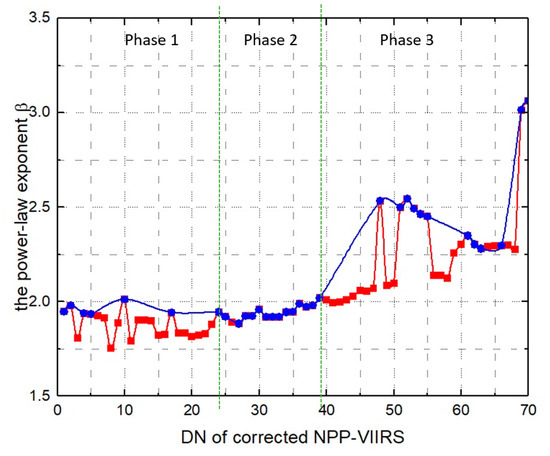 Furthermore, the generation (or definition) of fractals proposed by Jiang [8], and applied in many fields, including urban planning [58], transportation [59], and biodiversity [60]—a feature is thought to be fractal if the scaling pattern of “far more small things than large ones” can be observed multiple times—is adopted in this research. Since both the first generation fractals like Koch curve and Sierpinski carpet, and the second generation fractals in a statistical sense—a power-law relationship can be found between the measurement scale—are strict [61], and both definitions cannot directly work for complex geographical features. The fractal indexes have been computed for the NTL clusters in the previous paragraph. When , the fractal indexes at the DN values of 2 and 15 are 6 and 5, respectively. When , both the fractal indexes at the DN values of 24 and 30 are 7. When , the fractal index at the DN value of 52 is 4. Thus, the fractal index changes in the three phases.