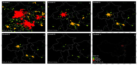 NTL clusters at varying thresholds from NPP-VIIRS data. The first map in the top row shows the NTL clusters at the optimal threshold in China, and the remaining five maps show the enlargement of the Beijing-Tianjin-Hebei metropolitan region when the potential threshold is set to thresholds in different categories, ( and ), the optimal threshold (), (), and (). The NTL clusters with different sizes are illustrated in a different color with 0–10 km² (green), 10–100 km² (peridot green), 100–1000 km² (orange), and >1000 km² (red).