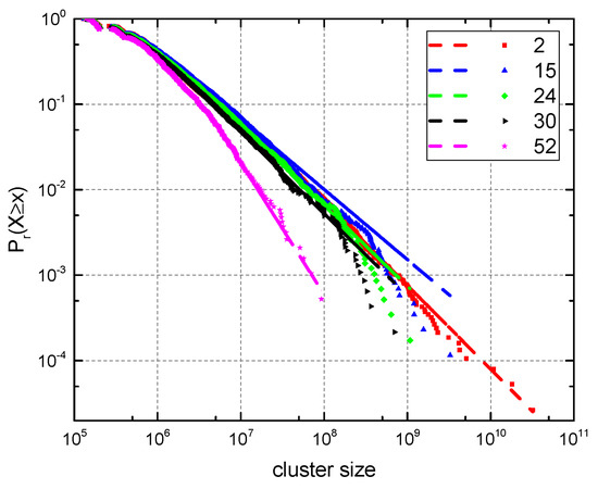 The log-log plot of the power-law distributions of the NTL cluster sizes at varying thresholds. When the potential threshold is set to 2 (red), 15 (blue), 24 (green), 30 (black), and 52 (magenta), the cumulative density distribution of the cluster sizes at each threshold is shown in the corresponding color, and its statistical power-law distribution function is displayed as the dotted line in the same color.