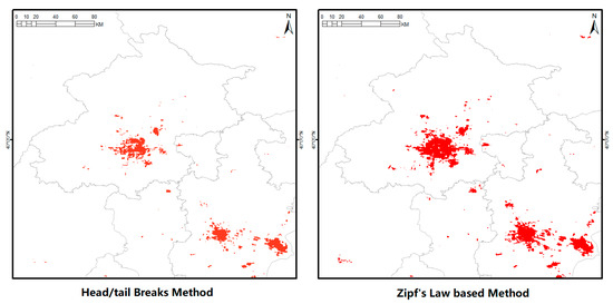 We utilize the same NPP-VIIRS data in China in 2013 to determine a threshold using head/tail breaks methods, as shown in Table 2. The value of 33.14 is the optimal threshold with the head/tail breaks method. The optimal threshold from the head/tail breaks method is greater than that from the Zipf’s law method. In detail, the value of 33.14 is greater than 24 ( in the Zipf’s law method) and less than 39 ( in the Zipf’s law method). Thus, the optimal threshold from the head/tail breaks method locates in Phase 2 (), where the NTL clusters capture the whole urban areas made up of several interconnected sub-areas, and the size of each spatially contiguous urban areas shrinks around the perimeter. For the urban areas derived from the head/tail breaks method, since the optimal threshold is in Phase 2, the power-law exponent is around 2 with a high goodness-of-fit, indicating the Zipf’s law behavior. However, the value of 33.14 is between the two endpoints of the interval in Phase 2 and closed to the right endpoint . Therefore, the change patterns of the urban areas are closed to breaking up. Figure 6 shows the urban areas around Beijing extracted from both methods. Although the urban areas capture the core in Beijing, separation patterns can be discovered in this stage and the sub-areas begin to appear.