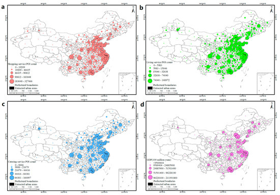 Since point of interest (POI) data, a new kind of location-based VGI (volunteered geographic information) data [49], can be utilized as a proxy for human mobility or social interactions such as understanding mobility based on GPS data, the POI data in China are utilized to explore the relationship between the extracted urban areas and social interactions for validation in Section 4.4. Due to the limits of data availability, POI data for the year 2014 are obtained and geo-coded from the business website maintained by GeoHey [50], as shown in Figure 2a. We assume that the POI data in two adjacent years were consistent, so the POI data from 2014 can be used in 2013. The POI data contain 45 million POIs categorized into 23 types, among which the shopping service POI, living service POI, and catering service POI are chosen to denote human activities. Thus, these three kinds of POI data are extracted and spatially and statistically analyzed at the prefectural level. There are 12.3 million shopping service POIs, 4.4 million living service POIs, and 5.3 million catering service POIs, as indicated in Figure 2b–d. These POIs are used to evaluate the response to social interactions.